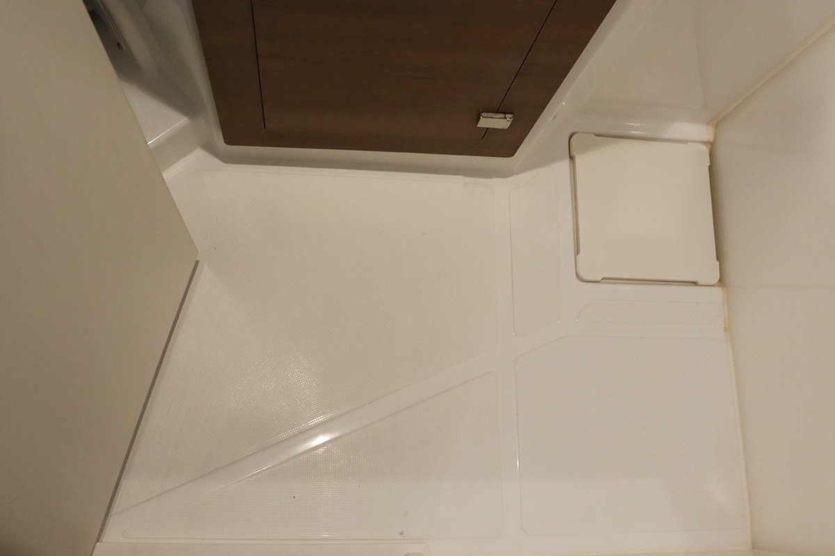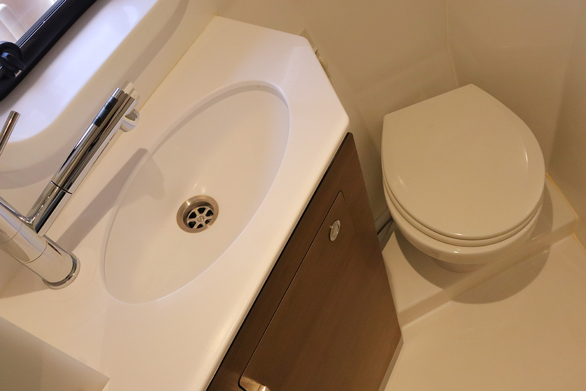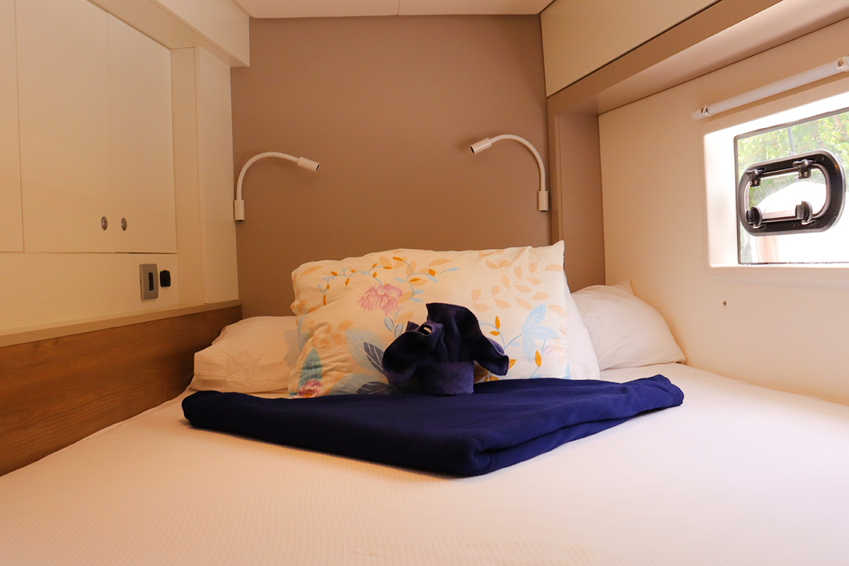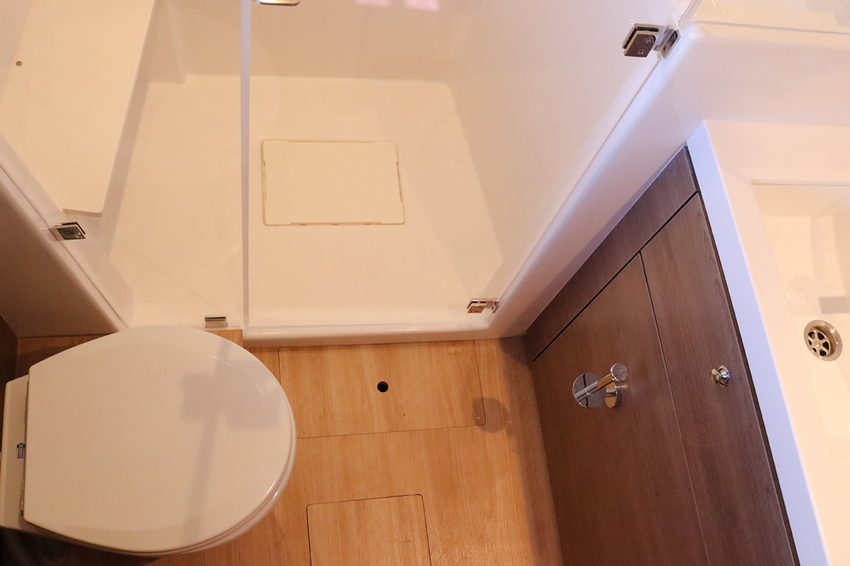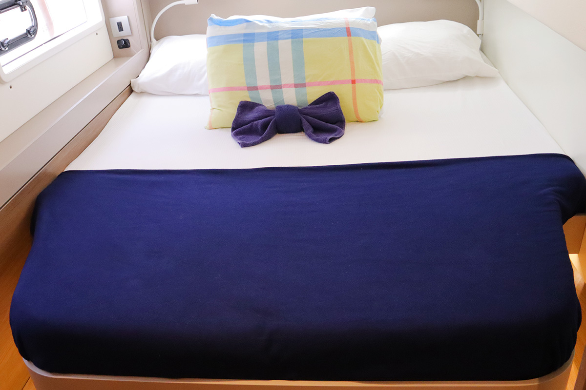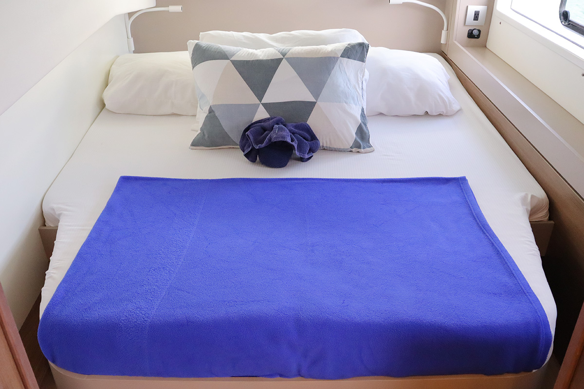 Finally you should know that the guest heads (washrooms in starboard hull) are not fitted with a shower head: they are toilet-only. The plumbing is there for a full ‘wet head’ but no shower head fitted! That said, the owner’s suite (port hull) has a wonderful and spacious full shower setup which can be shared with the whole crew. Other minor points: no microwave (we didn’t miss it) and no bow thruster, both of which were on the Yacht Overview.