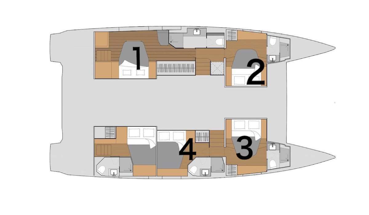 Step aboard Halcyon, a stunning 2024 51’ Fountaine Pajot sailing catamaran that redefines luxury on the water. Designed with both comfort and style in mind, Halcyon features 4 spacious queen cabins including a larger master cabin each with its own private ensuite bathroom complete with electric toilets, vanities, and separate showers.