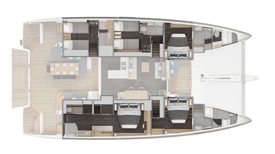 The full-beam owner’s suite includes private aft cockpit access, while three additional en-suite cabins ensure comfort for all guests. Smooth performance, modern design, and excellent stability make her ideal for families and groups seeking a premium catamaran experience.