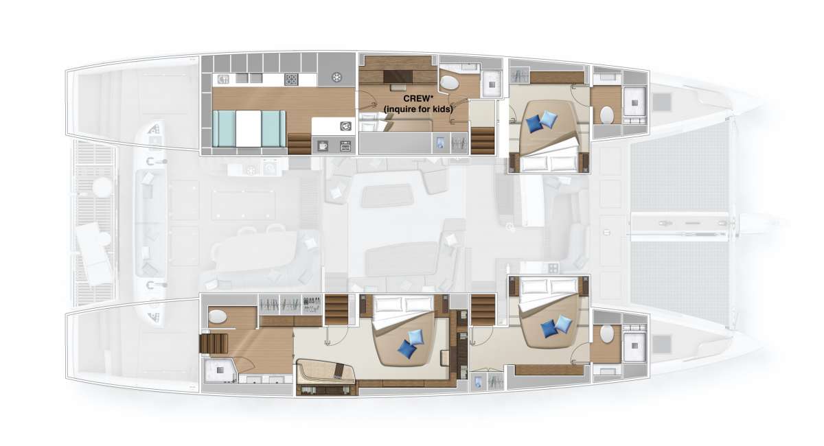 When on board the Lagoon SIXTY 5, you can look straight through fore to aft and out over your surroundings with commanding 360° views. Her elegant interior is by Nauta Design, and demonstrates the new signature “Connect” outfit from Nauta. The main saloon is comfortable and luxurious with open spaces and natural light. The same design concept has been applied to the guest cabins. They enjoy good overhead height and excellent natural light and views. The high level of finishing throughout every cabin reflects the luxury feel of the main saloon.
